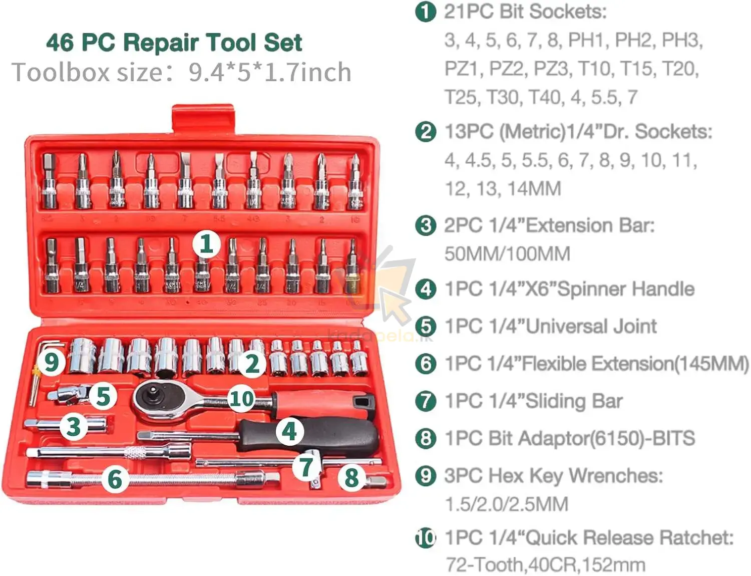 ✅ Includes screwdrivers, pliers, wrench, sockets, and more – total of 46 pieces