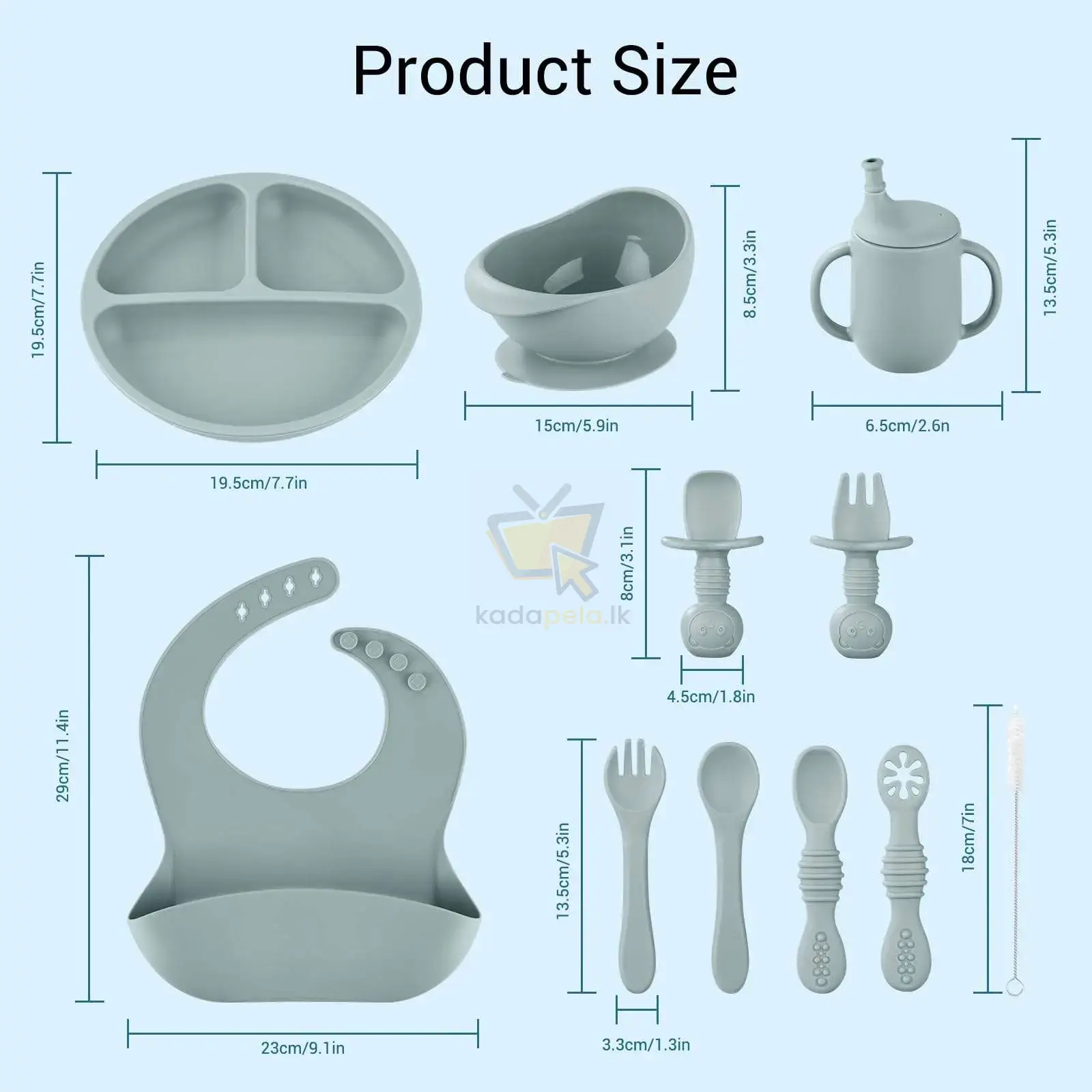 මෙම සෙට් එකේ අඩංගු වන්නේ බබාට අවශ්ය තට්ටු කෝප්ප, හැදි හා තවත් උපකරණයන් 8ක් වේ.